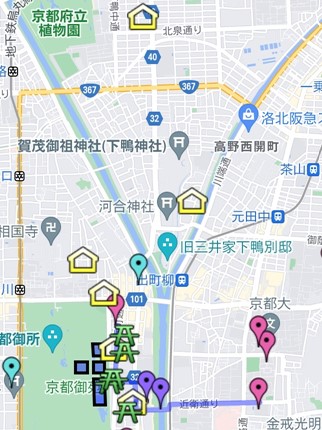 先のGoogleマップに示された京都市内の一部を図に示しました。黄色い家形の印が住まいの大雑把な位置を表している。上から下に、神殿町、泉川町、塔ノ段、円覚寺、染殿町、東桜町の家の位置である。この「湯川秀樹の生い立ちマップ」では苦楽園から神殿町に引っ越したとあるがこれは誤りである。1941年にJR甲子園口駅近くの借家に移り住んだ後に、1943年に京都市内に引っ越したというのが正解である。