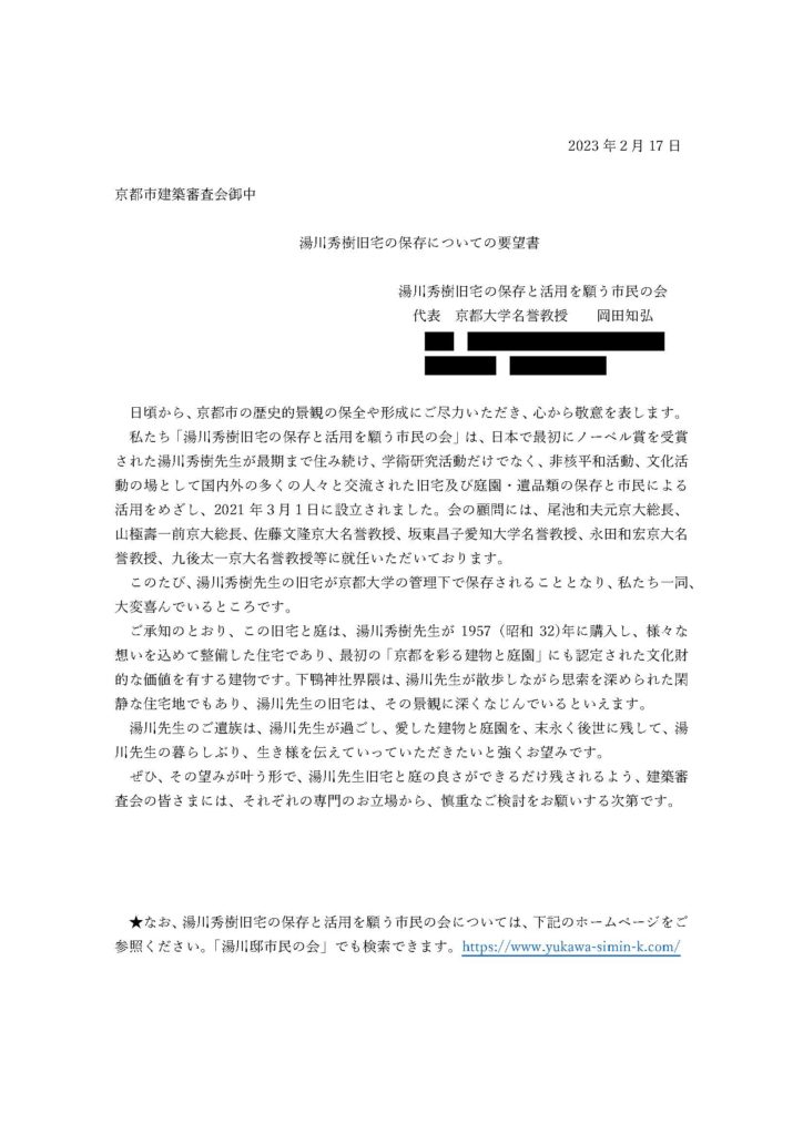 私たちが最も懸念したことは、当初構想されていた新湯川邸の建築イメージがあまりにも旧湯川邸と異なっており、下鴨神社近隣の景観との調和も乱されるのではないかという点と、湯川秀樹先生が愛された静かな庭の佇まいと居室を広く市民や次世代を担う若い人たちに追体験してもらいたいというご遺族の想いが具体化されないのではないかという点にありました。