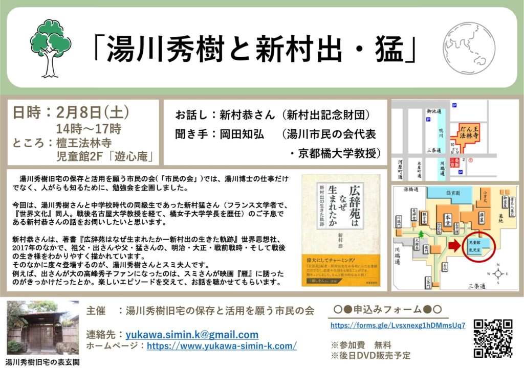 今回は、湯川秀樹さんと中学校時代の同級生であった新村猛さん(フランス文学者で、『世界文化』同人。戦後名古屋大学教授を経て、橘女子大学学長を歴任)のご子息である新村恭さんの話をお伺いしたいと思います。